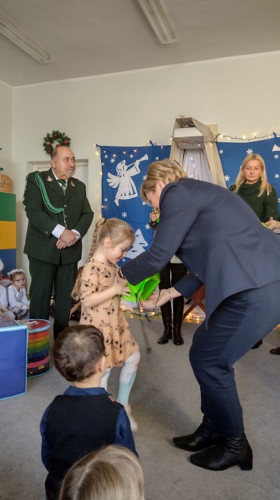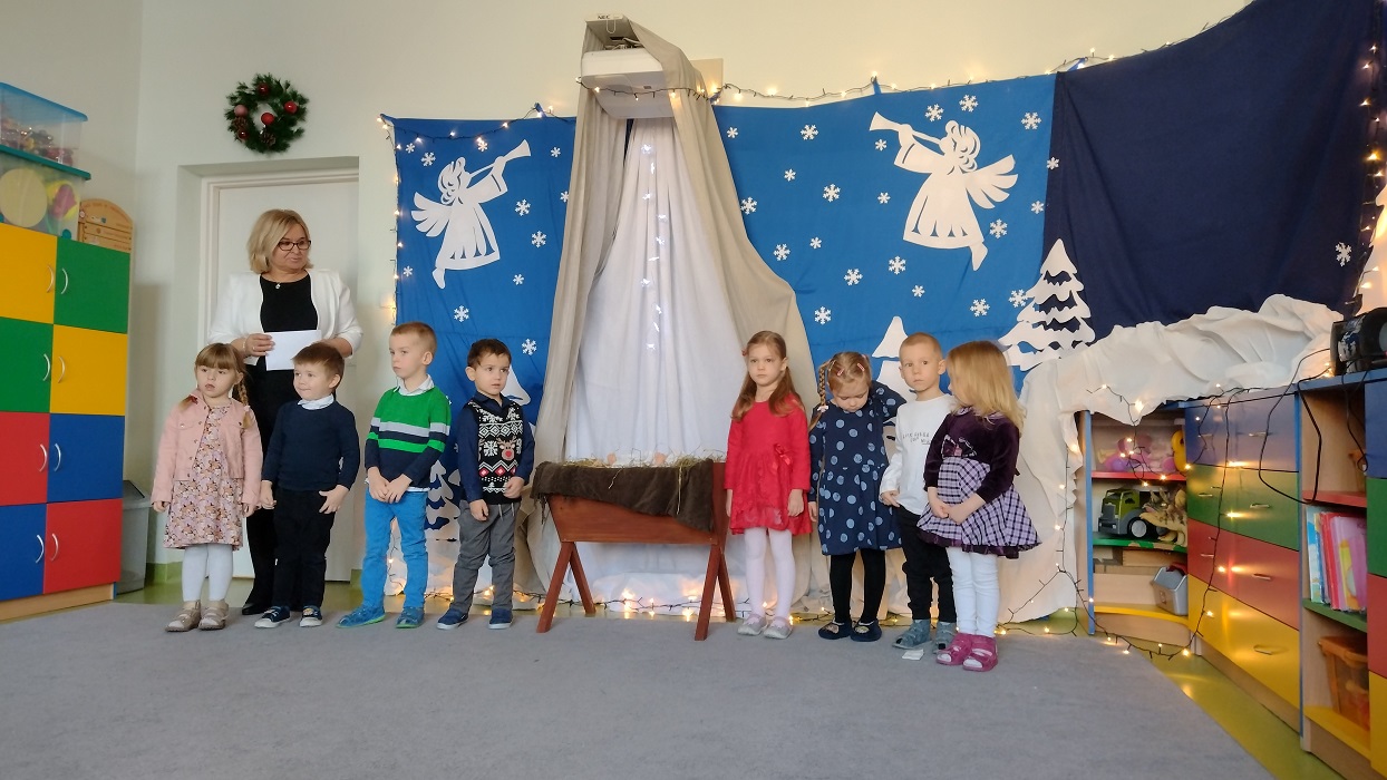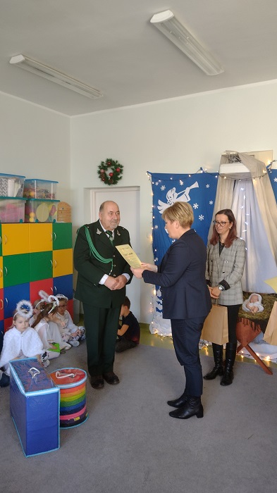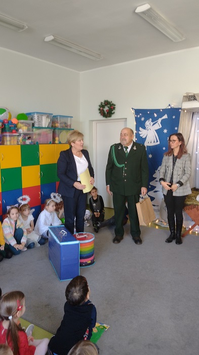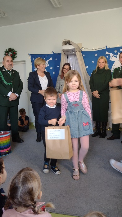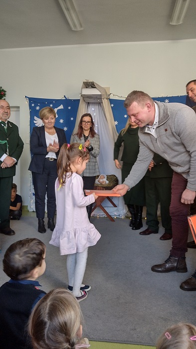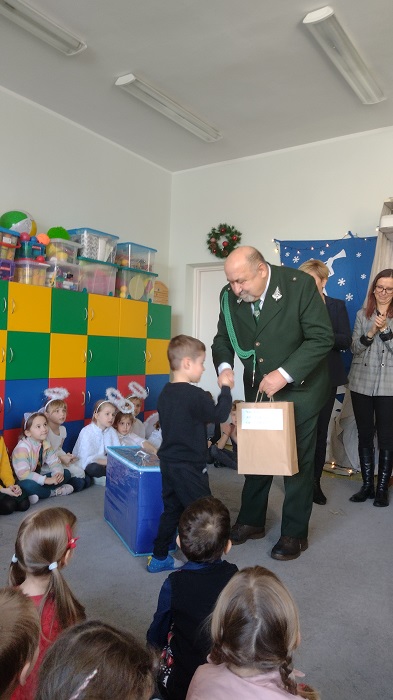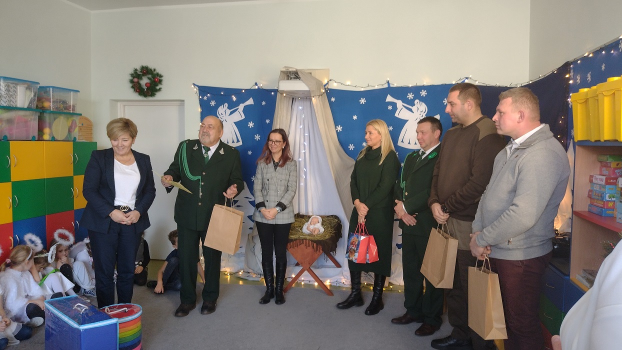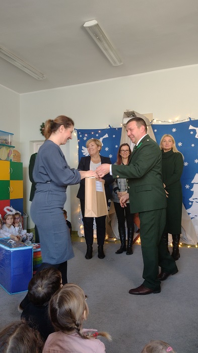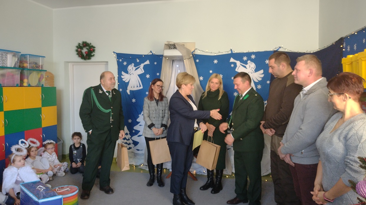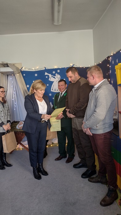Nagrody otrzymali: Igor Romanowski, Oliwia Przybysz, Ula Szurek, Basia Mickiewicz, Jakub Wileński, Lena Szafrańska, Szymon Pawłowski, Ala i Nikodem Bawoł, Antoni Kurgan, Ala Łepkowska. Na uroczystości gościliśmy Panią Dyrektor Marzannę Moszczyńską i Panią Martynę Mrozowską oraz przedstawicieli Koła Łowieckiego „Żubr” Panią Anetę Blunck, Panów: Tadeusza Osmędę, Tomasza Ciarkowskiego, Krzysztofa Szczepka, Roberta Kincel. Koło Łowieckie „Żubr” ufundowało pomoce dydaktyczne: Mega Domino (21 szt.) oraz poduszki kolorowe ze skóry od 1 do 10 do wykorzystania podczas zabaw w przedszkolu. Bardzo dziękujemy. Na tle przepięknej scenerii przedszkolaki wspaniale zaprezentowały się w montażu słowno – muzycznym o tematyce świątecznej.