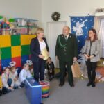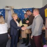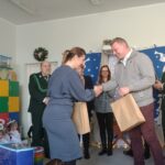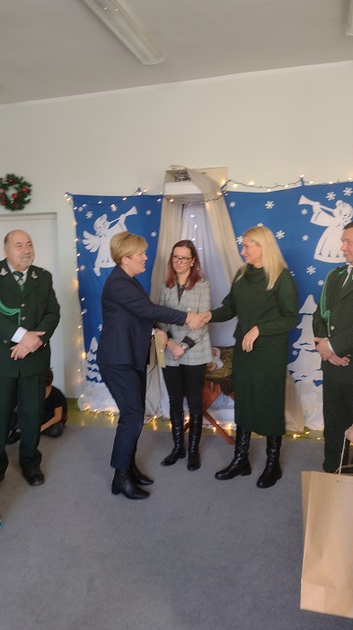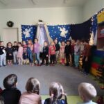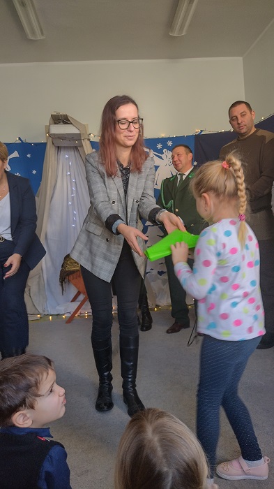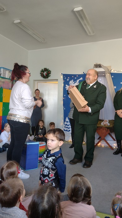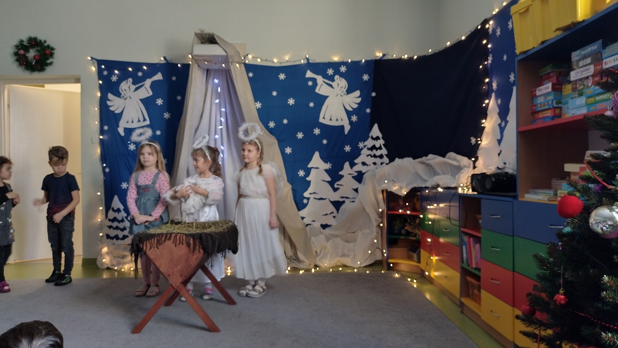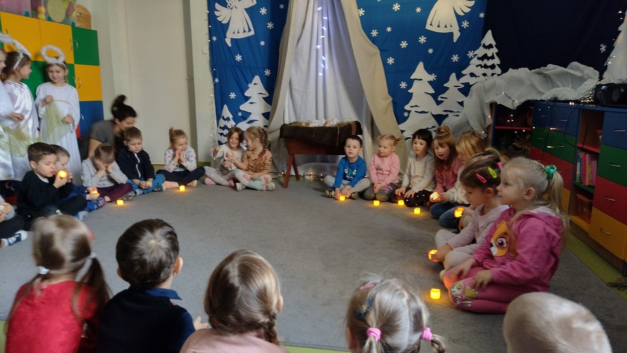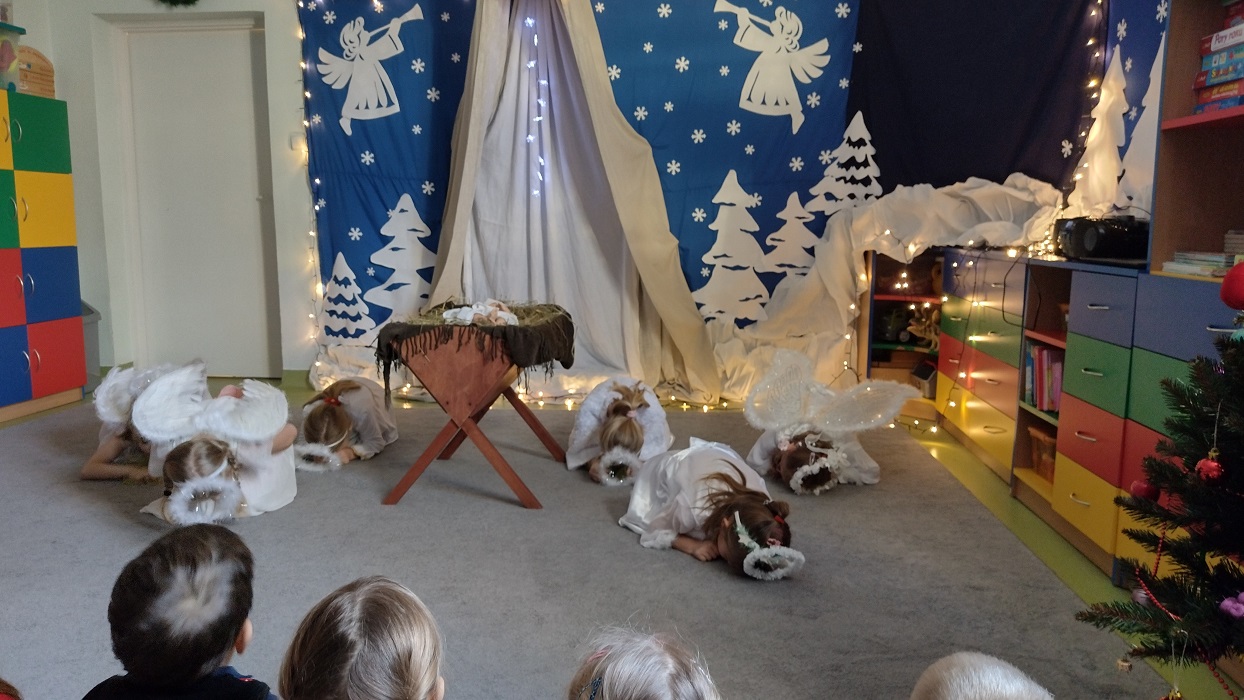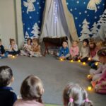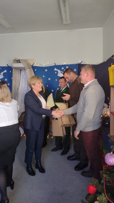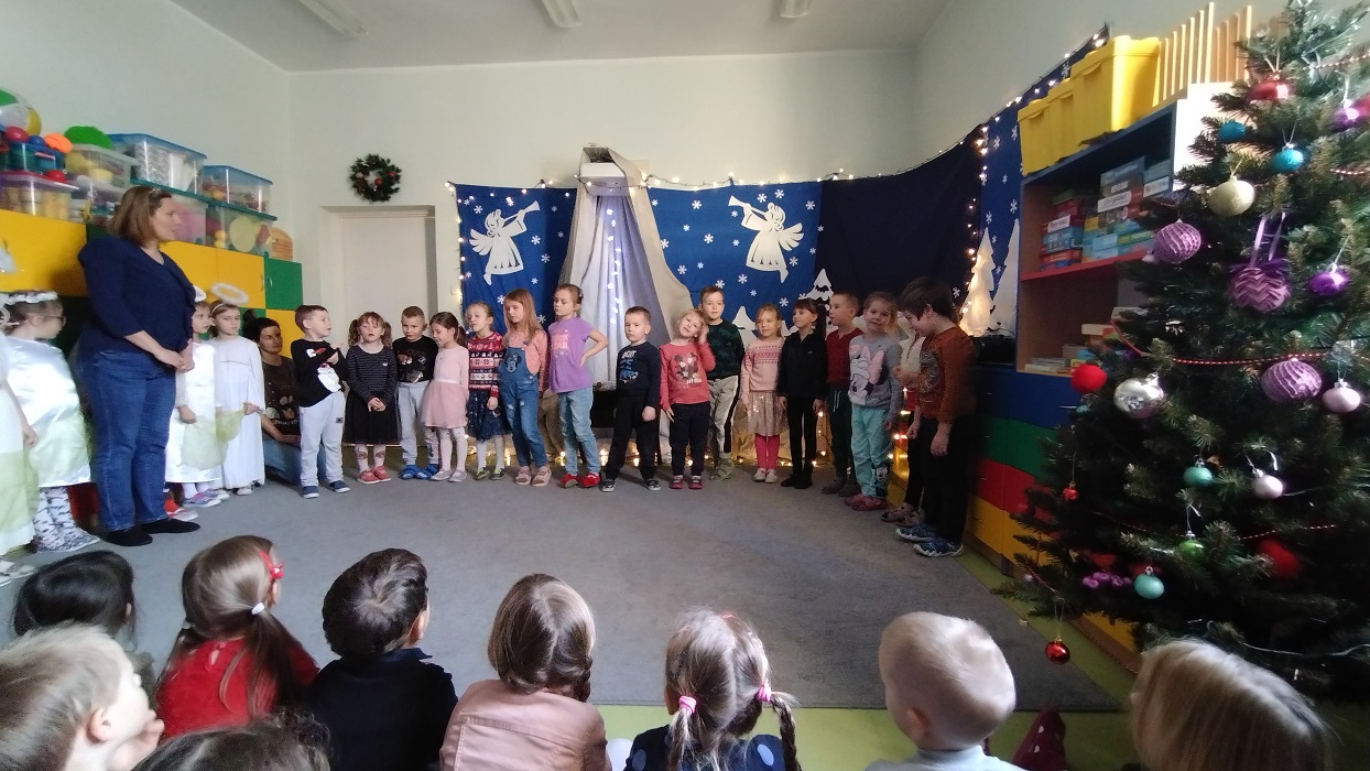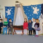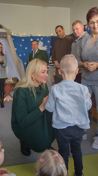 Nagrody otrzymali: Igor Romanowski, Oliwia Przybysz, Ula Szurek, Basia Mickiewicz, Jakub Wileński, Lena Szafrańska, Szymon Pawłowski, Ala i Nikodem Bawoł, Antoni Kurgan, Ala Łepkowska. Na uroczystości gościliśmy Panią Dyrektor Marzannę Moszczyńską i Panią Martynę Mrozowską oraz przedstawicieli Koła Łowieckiego „Żubr” Panią Anetę Blunck, Panów: Tadeusza Osmędę, Tomasza Ciarkowskiego, Krzysztofa Szczepka, Roberta Kincel. Koło Łowieckie „Żubr” ufundowało pomoce dydaktyczne: Mega Domino (21 szt.) oraz poduszki kolorowe ze skóry od 1 do 10 do wykorzystania podczas zabaw w przedszkolu. Bardzo dziękujemy. Na tle przepięknej scenerii przedszkolaki wspaniale zaprezentowały się w montażu słowno – muzycznym o tematyce świątecznej.