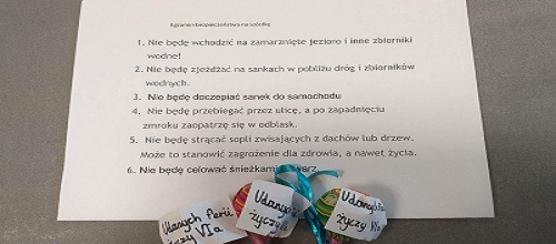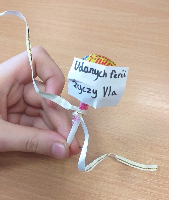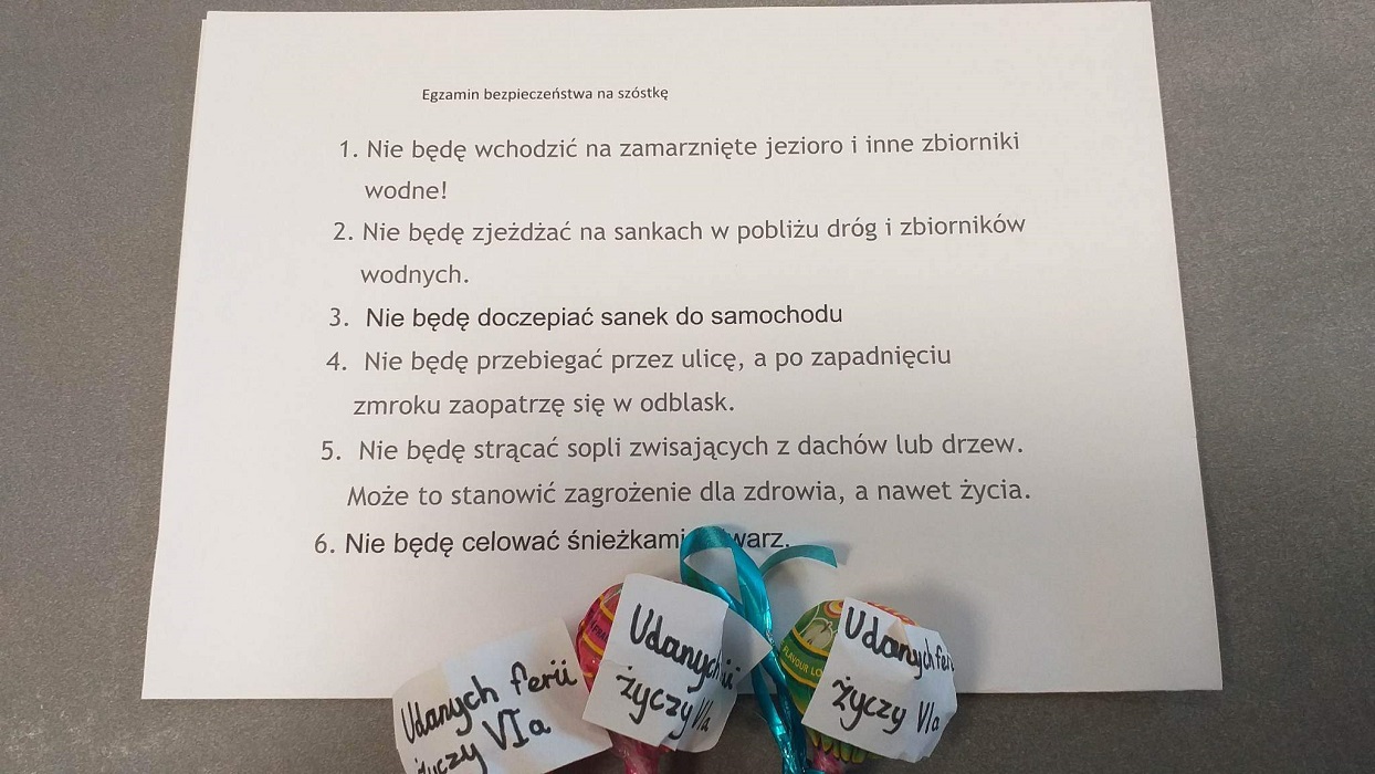 Uczniowie przygotowali wytyczne na zbliżające się ferie zimowe, zakładając, że jeszcze będzie biało. Teorię piątoklasiści zdali na szóstkę i obiecali, że po wypoczynku wrócą zdrowi i wypoczęci. Życzono sobie udanych, zdrowych i bezpiecznych ferii, a na koniec dosłodzono atmosferę kolorowymi lizakami. Na marginesie… – pan Marcin również złożył przyrzeczenie, że nie będzie rzucał śnieżkami w twarz.